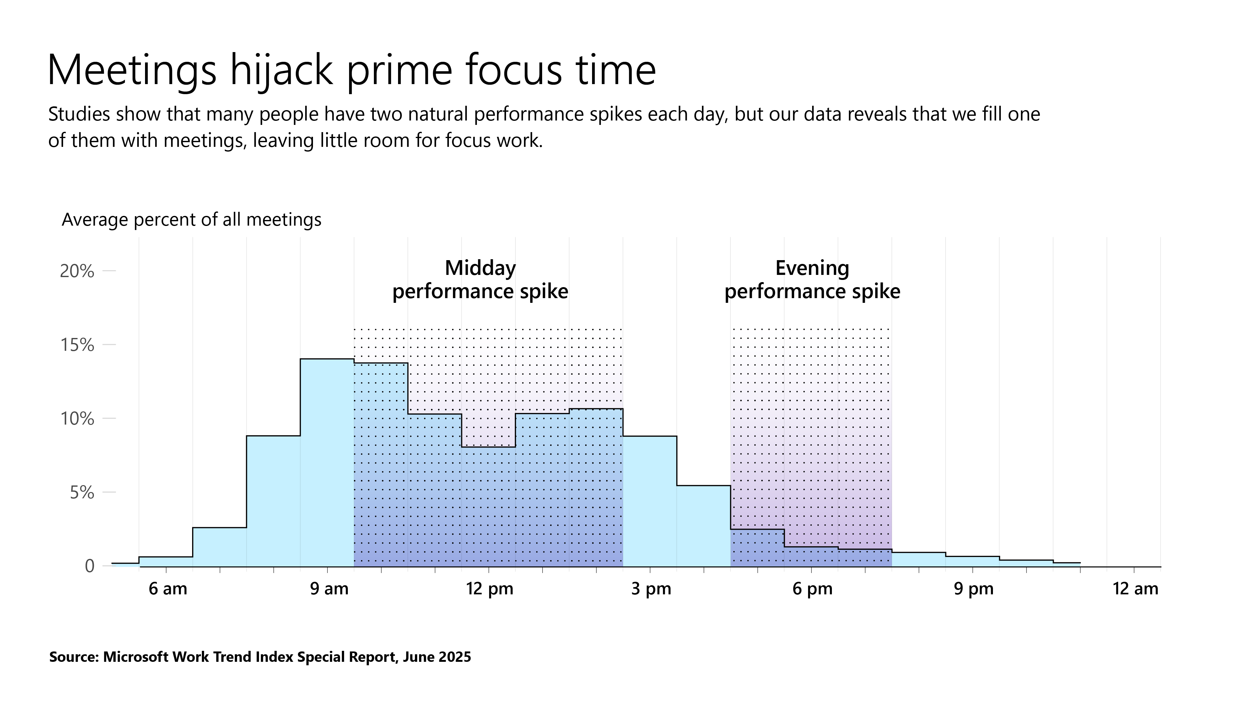 Po poranku przychodzą najbardziej produktywne godziny dnia. I co się wtedy dzieje? Połowa zebrań, spotkań, nasiadówek odbywa się między 9:00 a 11:00 oraz 13:00 a 15:00. Najlepszy czas na pracę wypełniany jest gadaniem. Najczęściej we wtorki najrzadziej w piątki. Co więcej, 57% spotkańodbywa się ad hoc, bez zaproszenia w kalendarzu, a co dziesiąte dodawane jest w ostatniej chwili. To nie sprzyja głębokiej pracy ani skupieniu.